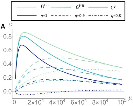 Inefficiency effect. We report the quantum gain over the three classical limit defined in the main text, for different values of overall efficiency . In panel (A), we show the dependency of the gain on the main number of signal photons . The case of perfect efficiency is reported in solid line, while the cases an are reported in dashed and dot dashed lines respectively. The distributions and are the same reported in the first row of Figure 2, namely , and . In panel (B), we fix the number of photons to and we show the dependency on the mean transmittance .