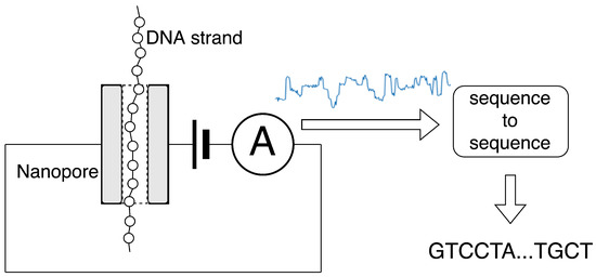 The ONT nanopore sequencing process is based on measuring ionic current in the nanopore when DNA/RNA strand is passed through it. The currents’ values are then translated to the sequence of bases, a task known as basecalling. It can be expressed as the function described in Equation (1) and is a sequence-to-sequence processing task. A schematic illustration of sequencing and basecalling is presented in Figure 1.