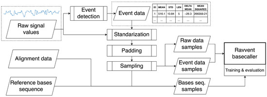 Time series with ground truth aligned data cannot be used directly for constructing a basecaller’s input data, since it is not available in typical sequencer output. We therefore propose the data preparation pipeline presented in Figure 2.