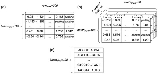 All data used in our work was processed with defined parameters: and . These details, together with batch size, are marked on schematic examples of data samples in the Figure 3. The value of was selected by us, with the assumption to cover wide enough span of raw data points and be short enough for performant RNN processing. was then set to a minimal number of events, always including all raw data points selected for a sample, based on the training part of real data. was adjusted depending on a conducted analysis. For read accuracy evaluation, it was set to 6.