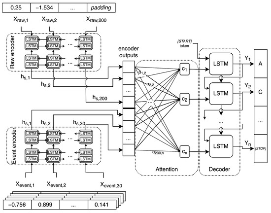 Figure 5 presents a general overview of the model structure. While processing raw data, the model consumes only raw data samples and passes them to raw encoder. Then, its output is used by attention mechanism and decoder, finally producing predicted bases sequence. Event data processing differs only in the two first steps, using event data samples and event decoder. For full joint processing, both data type samples and encoders are used in parallel. Then, their outputs are concatenated and passed to the attention mechanism and the decoder. Part of our architecture is described by Equations (2)–(4).