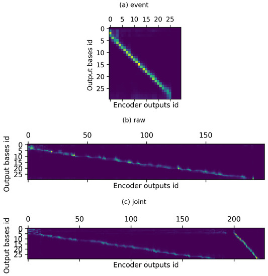 As for the joint data, its attention weight plot corresponds to the way in which twin encoder outputs are processed in the model, i.e., concatenation. Therefore, there exist two distinguishable parts in the plot, representing separate raw and event plots, which are concatenated. This therefore confirms that such a model utilises information jointly from parts of raw and event data—for each predicted output base there are encoder outputs attended to in both parts.