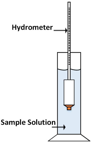A hydrometer is a traditional instrument that measures Brix in terms of SG. It works on the concept of buoyancy and is usually calibrated at room temperature (20 C) in different units such as Brix, Baume, and SG, as per the requirement [,,]. The working of hydrometer is based on Archimedes’ principle, which states that “the upward buoyant force that is exerted on a body immersed in a fluid, whether fully or partially, is equal to the weight of the fluid that the body displaces”. Hydrometer consists of a wide-bottom (for buoyancy) sealed hollow glass tube, a lead or mercury ballast for stability, and a graduated narrow stem for measurement as shown in Figure 2. Typically, a hydrometer is lowered into the liquid filled graduated cylinder until it floats freely. The point where the surface of the liquid touches the hydrometer’s stem is proportional to the relative density of the liquid.