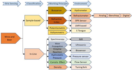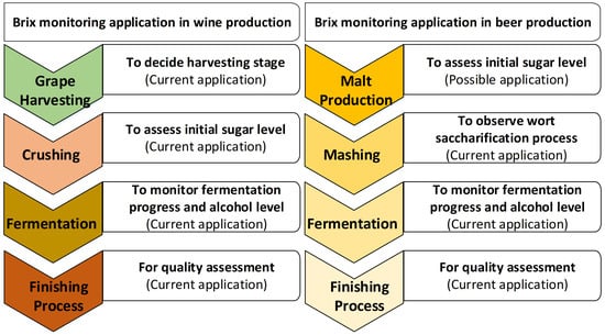 In wineries and breweries, optimised process control is the prime factor for enhancing wine or beer quality. This includes the quality assessment of physical properties of raw materials (e.g., grape juice/malt), process streams (e.g., ferments), and end products (e.g., wine/beer) []. The fermentation process control is crucial during the production of wine or beer to monitor the conversion from raw juice to alcohol []. It is important to observe the Brix level at the various stages of beer and wine production (Figure 5). In this section, different types of Brix monitoring methods that are used during the production of wine and beer are discussed.