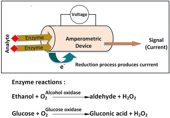 Most of the time, electrochemical biosensor devices are based on the amperometry principle, where electrochemical oxidation or reduction of an electroactive species produces the current and the resulting current is proportional to the concentration of the analyte. The basic working principle and the key enzyme reactions used in biosensors to determine the analytes are shown in Figure 6. The measurement system generally includes three electrodes (working, reference, and auxiliary electrodes). The working electrode is either metal (Pt and Au) or carbon-based material (glassy carbon, graphite, screen-printed, or carbon paste electrode) and is usually combined with immobilized enzymes [].