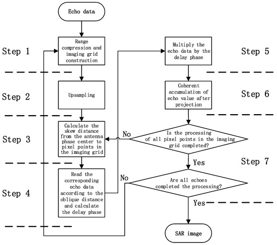 - Step 3: Calculate the distance from the antenna’s phase centre to pixel points in the imaging grid (corresponding to the calculation in Equation (5);