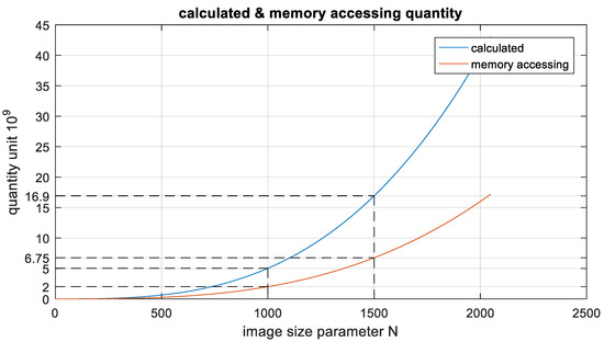 Plot of the quantity unit as a function of the image size parameter N for the calculated quantity and the number of memory reads and writes.