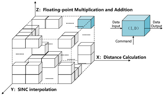 To improve the system processing capability and shorten the processing time, the BP algorithm needs to be parallelised. Parallel algorithmic processing is implemented with single-instruction, multiple-data (SIMD), and multiple-instruction, multiple-data (MIMD) processing models in three dimensions. The first dimension is distance calculation. Each distance projection of the BP algorithm is completely independent. Combined with the computing resources of each path, 16 paths are designed for parallel execution of this dimension. The second dimension is SINC interpolation [33]. The optimised flow chart shows that after the distance calculation, the echo needs to be upsampled. The upsampling uses an 8-point interpolation core. Thus, eight paths are designed for parallel execution. The third dimension is floating-point multiplication and addition [34]. More than eight blocking operation cycles are required for each high-precision data multiplication and addition, which makes the entire process unable to achieve efficient pipeline processing. Therefore, it is necessary to improve the throughput through parallel processing by adopting the eight-path parallel execution. In summary, the three dimensions perform sixteen-path, eight-path, and eight-path parallel processing, respectively. There are 1024 processing units in each clock cycle. The first and the second dimensions are MIMD, and the third dimension is SIMD. The schematic diagram of parallel processing is as Figure 11.