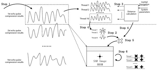 Step 1 receives echo data while performing range pulse compression on the echo data, and makes 16 copies of the compressed data to prepare for subsequent parallel calculation; step 4 receives the inertial navigation information and system parameters in 16 parallel threads to calculate the slant range by passing the calculated results to steps 3 and 5; step 3 receives the distance information, indexing each range pulse pressure result and exporting the outputs to step 2; step 2 receives the data and starts processing in eight parallel threads; step 5 receives the data from steps 2 and 4, and processes with high precision multiplication, writing the result to the Block RAM (BRAM); step 6 reads the BRAM data and initiates the multiple accumulation operation of eight parallel threads. The three-dimensional processing model corresponds to steps 4, 2, and 6, respectively. After the parallel optimisation, the data throughput rate can reach 200 Gsps, which meets the requirements of the BP algorithm for real-time imaging data calculation of the throughput rate.