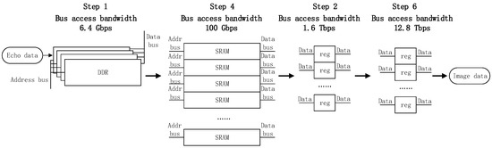 Combined with parallelised design, the advantages of three types of memory are fully utilised to realise high-throughput computing. The first parallel dimension 16-way calculation is implemented by SRAM, the single-way port width is 32-bit, the interface speed is 200 MHz, and the bus speed is 100 Gbps; the second parallel SINC interpolation eight-way calculation is implemented by register storage, and the single-way port width is 64. The bit-interface speed is 200 MHz, and the bus speed is 1.6 Tbps; the third parallel, high-precision, multiply–add, eight-way calculation is implemented by register storage. The single-channel port width is a 64-bit interface operating at the frequency of 200 MHz, and the bus speed is 12.8 Tbps. The dynamic RAM buffer is added in the echo input and image result output, thus realising the isolation of the processing clock and data flow rate and improving the running speed of the entire calculation process. Based on the above design, the throughput of ultra-high data rate in the operation process is realised as Figure 13.