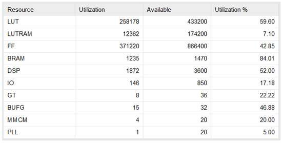 The time-domain BP algorithm for SAR imaging is implemented in a Xilinx XC7VX690T FPGA chip. The development board contains one unit of XC7VX690T FPGA and an external 16 GB DDR3, whose clock speed is 1333 MHz. The bus is 64-bit wide. The FPGA has a clock speed of 200 MHz. In all, 16 threads perform phase calculations. If the input data is 16 bits, the maximum data input rate is therefore 51.2 Gbps. The resource usage is analysed in the Vivado development environment of Xilinx Inc. and the screenshot of the Vivado analysis result is shown in Figure 15 below.