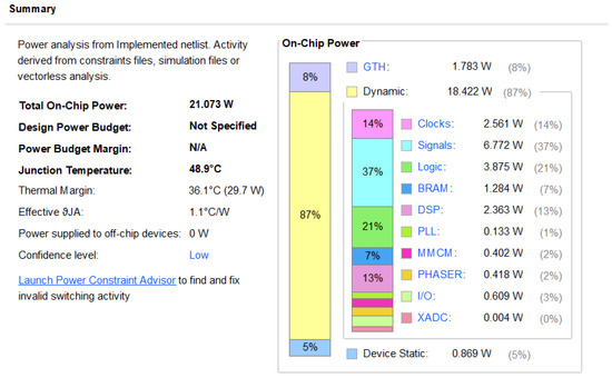 In conclusion, a single XC7VX690T FPGA chip resource can be fully utilised to complete a 900 × 900 imaging grid. Vivado energy consumption analysis shows that the project has a power consumption of 21.073 W, and the power consumption of each resource was analysed by Vivado as indicated in Figure 17 below.