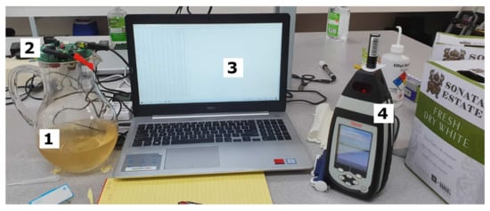 Example of setup used to measure: (1) wine samples using a (2) low-cost electronic nose connected to a (3) personal computer to collect and save data, and (4) MicroPHAZIR™ RX analyzer.