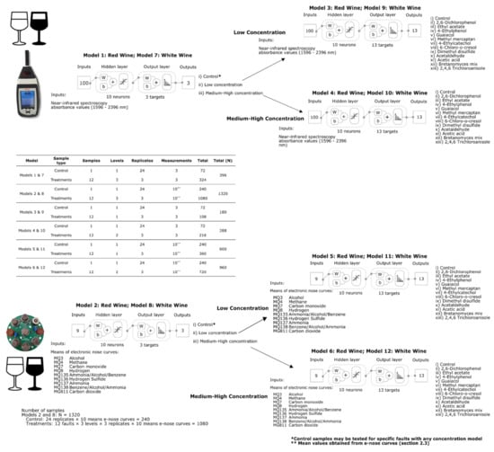 Once the concentration of faults is predicted using either of the previously described models (Models 1, 2, 7 and 8), Models 3, 5 for red wine, 9 and 11 for white wines should be used to identify the specific fault present in the low concentration samples. This is achieved using NIR absorbance values (1596–2396 nm) as inputs for Models 3 and 9 and e-nose outputs for Models 5 and 11. Likewise, Models 4, 6 for red wine, 10 and 11 for white wines should be used to identify the specific fault present in the high concentration samples using NIR absorbance values (1596–2396 nm) as inputs for Models 4 and 6 and e-nose outputs for Models 10 and 12 (Figure 2). For all the models, samples were also divided using interleaved indices into training (70%) and testing (30%); the specific number of samples for these models will be presented in Results and Discussion section. For all models, 10 neurons resulted in the best accuracies and performance after a neuron trimming exercise testing three, five, seven, and 10 neurons.