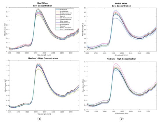 Chemical fingerprinting obtained from the near-infrared spectroscopy measurements within the 1596–2396 nm range. Curves display the results from (a) red wine and (b) white wine raw absorbance values from low and medium–high concentration samples.