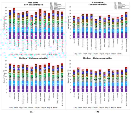 Electronic nose mean values from each gas sensor for (a) red and (b) white wine for low and medium–high concentration samples, showing the letters of significance (a–h) between samples based on Tukey’s honest significant difference (HSD) test (p < 0.05).