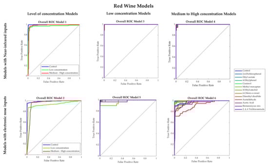 Table 3 shows that Models 1 and 2 had high overall accuracies (Model 1: 96%; Model 2: 94%) to classify red wine samples into control, low and medium–high concentrations of faults using NIR and e-nose inputs, respectively. Both models had high performance and no signs of overfitting as the training MSE values (Model 1: MSE < 0.001; Model 2: MSE = 0.02) were lower than the testing stage (Models 1–2: MSE = 0.08). Furthermore, in Figure 5, which shows the receiver operating characteristics (ROC) curves, it can be observed that for both Models 1 and 2, low concentration presented the lowest true-positive rate (Model 1: 0.93; Model 2: 0.87).