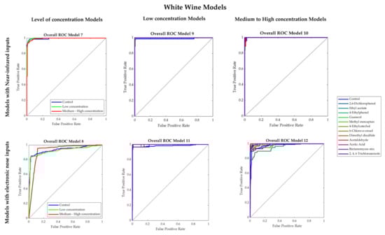 Models 9 and 10, which were developed using the NIR inputs to predict the specific faults present in the white wine samples with low and medium–high concentration, respectively, had very high accuracies (Model 9: 97%; Model 10: 96%), with no signs of overfitting based on their performance values. According to the ROC curves (Figure 6), in Model 9, the lowest true-positive rates were from in 2, 6-dicholophenol (0.89), 4-ethylcatechol (0.89), and 2,4,6 tricholoanisole (0.89), while in Model 10, the lowest values were from methyl mercaptan (0.83), 6-cholo-o-cresol (0.90), and acetaldehyde (0.90). On the other hand, Models 11 and 12, developed using the e-nose inputs to predict the specific faults present in the white wine samples with low (Model 11) and medium–high concentration (Model 12), presented accuracies of 97% and 92%, respectively. Both models had high performance and no signs of overfitting. From the ROC curves, it was found that 4-ethylcatechol (0.93), acetaldehyde (0.93), and 2,4,6 tricholoanisole (0.93) had the lowest true-positive rates in Model 11. Moreover, in Model 12, the lowest true-positive rates were given by the 4-ethylphenol (0.78) and Brettanomyces mix (0.88).