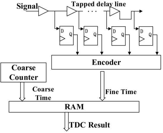 The architecture of the FPGA-TDC implemented with TDL interpolation is shown in Figure 1. The coarse counter is used to record the number of the clock period, achieving a wide range time interval measurement. TDL is used for interpolation, measuring less than one clock period as fine time. The resolution of the TDC is the cell width of TDL. When a 0-to-1 transition occurs to the input signal, the D-flip-flop group begins to convert 0–1. At the next rising edge of the clock, the D-flip-flop group obtains a thermometer code. The encoder converts the number of 1 in the thermometer code into a binary number that represents how many delay units are inserted in the time interval between the input signal arrival and the next rising edge of the clock.