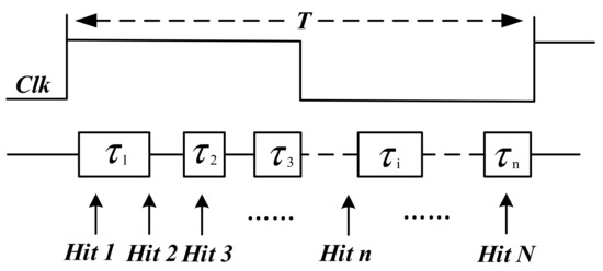 The TDL construct of the carry chain inside FPGA is non-uniformity because of manufacturing process technology and has some ultrawide bins due to extra route and clock skew, which results in large nonlinearity and poorer precision. Therefore, calibration for carry chain is required to obtain accurate measurements. There is a statistical approach that can provide bin-by-bin calibration [17]. As shown in Figure 3, represents the size of the i-th bin. Hits are random signals distributed within the range of the clock period (0, T), so the time interval between the hit and the rising edge of the clock is completely random. The number of hits captured by the bin is proportional to its size. When a large number of hits are fed into the chain, we can use the counts captured by the i-th bin as its size. Assuming the total number of hits is N, the size of the i-th bin is:
