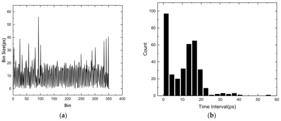 The bin size of carry chain in the Xilinx Kintex-7 device is show in Figure 4a. According to Figure 4b, the typical bin size is approximately 15 ps, while the largest bin size is 56 ps, and approximately 100 bins have a small size because of the non-uniformity in the carry chain and because of differences in clock skew on the clock distribution tree.