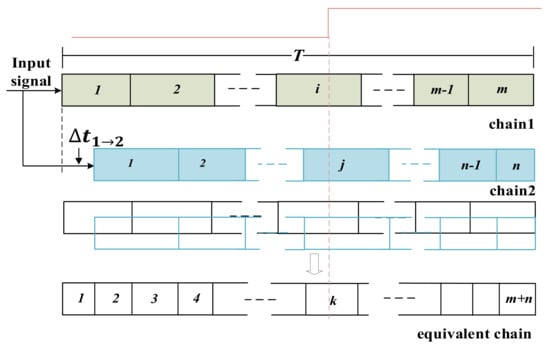 The principle and implementation of multichain cross segmentation method. As mentioned above, non-uniform and ultrawide bins of the carry chain limit the precision of TDC, and temperature fluctuation deteriorates measurement accuracy. We subdivide the ultrawide bin by mutual segmentation between parallel chains, and finally merge all the chains into an equivalent chain. The bin size of the equivalent chain is smaller and more uniform, which breaks the limit of the intrinsic cell delay of single chain and is temperature tolerant. It is easy to illustrate the principle of multichain cross segmentation method by using two chains. As shown in Figure 5, chain1 and chain2 have respectively m and n bins (, where different rectangles represent different sizes. The bin sizes of the chain are non-uniform, and the two chains are not exactly identical. Moreover, different chains have different physical positions, so the routing delay from the signal input port to each chain is also different. Based on the above two points, the same input signal in different chains pass through different bins. According to Figure 5, the routing delay of the second chain relative to the first chain is , and the rising edge of the input signal falls in the i-th bin of the first chain and in the j-th bin of the second chain. It is equivalent to that of the rising edge of the input signal that falls on the k-th bin of the equivalent chain, where k = i + j. We can see that by merging two chains into an equivalent chain, the ultrawide bin are segmented significantly. The averaged bin sizes of chain1 and chain2 are and , respectively. The averaged bin size of the equivalent chain is , which is approximately half the averaged bin size of a single chain.