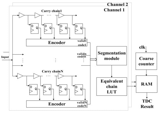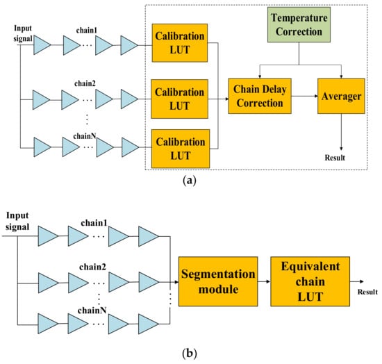 The multichain cross segmentation method is fundamentally different from the multichain measurements averaging method used in ref. [20]. It is mainly reflected in three aspects: resolution, architecture, and temperature coefficient. The block diagram of multichain measurements averaging is shown in Figure 14a. Multiple parallel chains are used to measure the input signal simultaneously, and the average of multiple measurements is taken as the final fine time. Theoretically, the resolution is improved by times, where N is the number of parallel chains. The block diagram of multichain cross segmentation is shown in Figure 14b. N chains are merged into an equivalent chain through mutual segmentation, which is equivalent to increasing the number of bins for interpolating one clock period, and the resolution is improved by N times. Secondly, the multi-chain measurements averaging method requires us to build calibration LUTs for each chain, and the delay between different chains also needs to be calibrated before averaging. On the contrary, the multichain cross segmentation method only needs one LUT for the equivalent chain, and the timestamp can be obtained directly without multitime measurements. Thirdly, the bin size of plain chain is affected by temperature variation, which cannot be reduced by averaging, so this architecture needs a corresponding calibration strategy. However, the bin size variation of plain chain due to temperature can also be segmented by other chains. After multichain cross segmentation, we can obtain an equivalent chain with fine granularity and uniformity bins. Therefore, the effect of temperature variation will be reduced significantly.