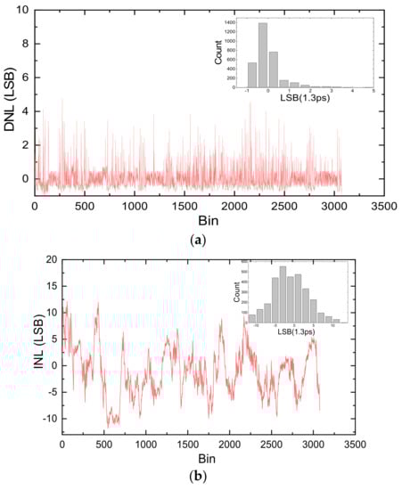Differential nonlinearity (DNL) and integral nonlinearity (INL) are used to characterize the nonlinearity of TDC. DNL is defined as the difference between the actual bin size and the averaged bin size, and INL is the sum of DNL from the first bin to the current bin, which can be calculated according to the bin size information. The DNL and the INL of 10 chains are shown in Figure 9a,b, respectively. The DNL is from the range of (−0.99, 4.79) LSB, and the INL is from the range of (−14.18,13.16) LSB.