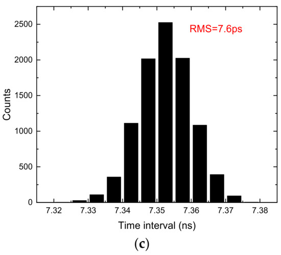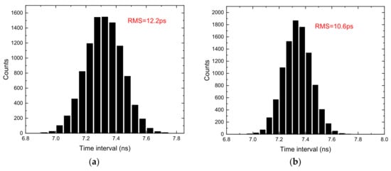 In addition to the averaged resolution and nonlinearity, TDC has a more important index: RMS precision. The standard deviation of the measurement results for a fixed time interval is used to characterize the RMS precision. The cable delay method is usually used to measure the RMS precision [18]. The hits for the two channels are fed by the signal generator through T-SMA connectors and cables. Figure 10 shows the RMS precision of the time interval measurement with different chains. In Figure 10a the RMS is 12.2 ps with single chain. From Figure 10b,c we can see that the RMS is improved up to 10.6 ps and 7.6 ps with 3 chains and 10 chains, respectively. The RMS value is improved with the increase of the number of chains.