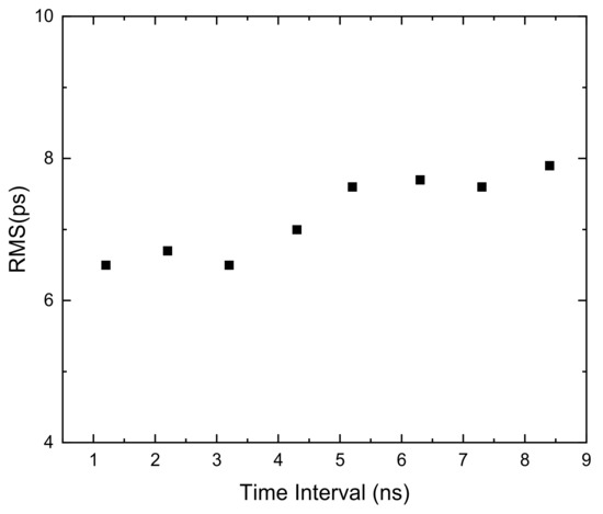 The RMS for different time intervals is measured with 10 chains, as shown in Figure 11. The precision of large-scale time intervals depends on fine measurement. Therefore, we only need to measure the time intervals covering one clock period (4 ns). The measurement results show that for the time intervals from 1 ns to 9 ns, the RMS is roughly the same, and reaches 6.5 ps at its peak. The single-shot precision of the single channel is 4.6 ps which equals .
