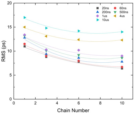 To observe the improvement brought by the multichain segmentation, we also used TDCs with different number of chains to measure different time intervals. The results of RMS precision for these TDCs are compared in Figure 12. The RMS precision of the short time interval increases as the number of chains increases. For example, the RMS values of 60 ns time interval with single chain, 6-chain, 10-chain are 11.5 ps, 8 ps, and 6.7 ps, respectively. With the increase of time interval, the RMS precision deteriorates, and the extent of improvement shows saturation characteristics as the number of chains increases. The RMS values of 4 us time interval with single chain, 6-chain, 10-chain are 15 ps, 12.4 ps, and 12.3 ps, respectively.