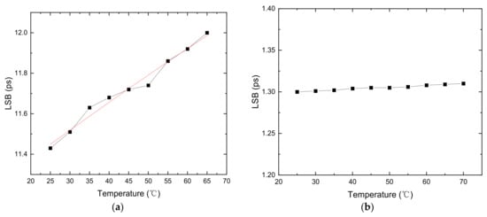 As mentioned above, the multichain cross segmentation TDC will reduce the effect of temperature variation. We observed bin size variations of plain TDC and multichain segmentation TDC with 10 chains in the operating temperature range of 25 °C to 70 °C. The FPGA chip was heated with a hot air gun. The operating temperature was measured with an XADC with an integrated sensor and can monitor the temperature of the FPGA chip in real time. At each test temperature point, we maintained the temperature for a period of time and measured it many times during this period. As shown in Figure 13a, we observed that the bin size of plain TDC varied almost linearly versus temperature. For the temperature from 25 °C to 70 °C, the LSB increases from 11.43 ps to 12.05 ps. The temperature coefficient is 0.014 ps/°C. Bin size of 10 chains TDC versus temperature is shown as Figure 13b. The LSB is almost the same with different temperature. The LSB increases from 1.30 ps to 1.31 ps with the temperature from 25 °C to 70 °C. The temperature coefficient reduced to 0.0002 ps/°C. The results show that the TDC using the multichain cross segmentation method has a very low temperature coefficient, which effectively improves the effect of temperature variation.