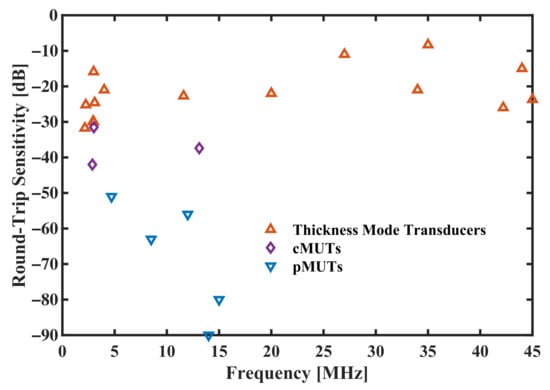 Round-trip sensitivity comparison between pMUTs, cMUTs and thickness mode transducers.
