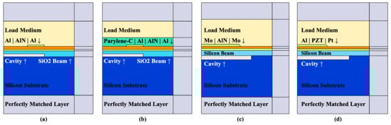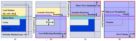 Figure 3 shows the configuration of 2-D axisymmetric FEM transmitting model. The geometries are not in proportion in order to show each domain clearly. The substrate material is silicon in <100> orientation [] (when using 2D axisymmetric model, the material will lose part of its anisotropic property in the rotation angular direction), the loading medium (fluid) is sunflower oil [], Appendix A gives all the material properties used in the cavity-pMUT. The peripheral area of the model is an artificial domain, i.e., a perfectly matched layer (PML), where wave propagation is completely damped without reflection []. The “Typical Wavelength” parameter for PMLs in COMSOL, i.e., maximum stretched length, is set for the longest wavelength in both the loading medium and solid region—9000 [m/s]/Frequency. The outermost boundary (exterior edge of the PMLs) is “Low-Reflecting Boundary” for the solid region [] and “Plane Wave Radiation” for the fluid region [], respectively, to further enhance the wave absorption. At this same boundary, the electrical condition is the default “Zero Charge” one.
