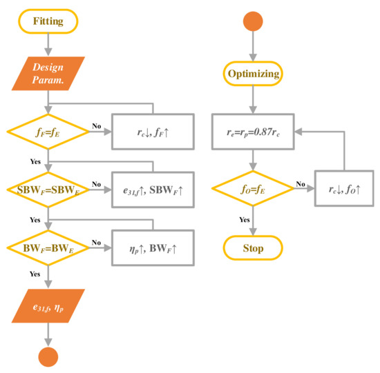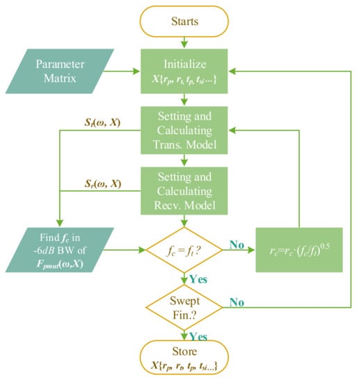 In general, the program opens the transmitting model and receiving model in sequence, edits the models’ parameters and executes the calculation in COMSOL’s kernel, then extracts the required data to calculate and SBW. As is the center frequency of −6 dB bandwidth of , it can be changed when the geometrical parameters are swept in the optimization process. So in the program, a switch loop is used to adjust the cavity radius in a way that always meets the target frequency . According to clamped plate’s vibrating theory [], the pMUT resonance frequency can be estimated by the following relation: