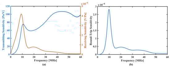 The product of round-trip sensitivity and relative bandwidth (SBW), is calculated by Equation (3), where is the −6 dB bandwidth of the round-trip sensitivity , is average value of the upper and lower bounds of −6 dB bandwidth.