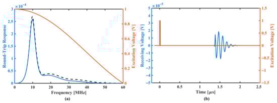 Pulse-echo simulation results, where blue line denotes the pMUT element and orange line denotes the square-wave pulse. (a) shows absolute frequency spectrum of the pulse, the round-trip response and the reception spectrum (dotted line). (b) shows time-domain waveforms, respectively.