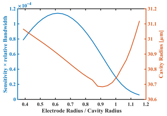 The optimization starts with the validation of traditional pMUT design [], in which the top electrode radius is first optimized. The program sweeps the top electrode radius from 12 m to 36 m, and the initial cavity radius is 30 m. By adjusting the cavity radius, the program holds at the target center frequency of 10 MHz, seen Figure 8.