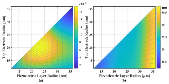 The results are plotted as pseudo-color images in Figure 9a, where each pixel point represents a swept and radii with the working frequency convergent at 10-MHz-target-frequency by adjusting the cavity radius . The corresponding data is shown in Figure 9b. The maximum SBW is very close to the hypotenuse of the triangular figure, where = 21.0 m, = 23. 2 m with = 30.9 m or , and . The 2 m difference between and is probable due to effect of the load medium’s dielectric field. In the actual fabrication process, this difference can be neglected, since etching the piezoelectric layer by self-alignment (where ) can save an additional group of lithography processes.