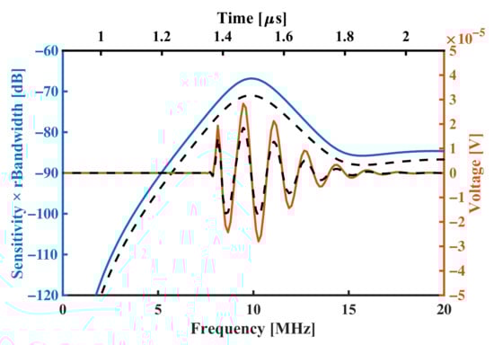 To simulate the time domain response, we first calculate the frequency spectrum of an arbitrary excitation waveform (in time domain), and multiply it with calculated round-trip sensitivity . The resulting frequency spectrum is then inversely transformed into time domain using inverse Fast Fourier Transform (IFFT), seen in Equation (2).