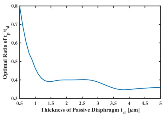 The optimal thickness ratio of can be derived from the figure above, which is 35∼40%, as shown in Figure 14. However, it should be noted that the step sizes for thickness optimization are divided equally during the sweep, which leads to difficulties in retrieving the optimal ratio accurately for pMUT of very thin passive diaphragm.
