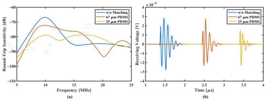 Finally, the sensitivity performance and pulse-echo simulation are calculated and shown in Figure 16. The pMUTs with matching layers both show compromised sensitivity in Figure 16a, however they all have expanded bandwidth, of 69% and 104% for the 67 m thickness and 25 m thickness PDMS matching, respectively. Figure 16b gives a time-domain evaluation based on the excitation of a 16.67 ns width square-wave pulse. The pMUT with 67 m PDMS shows a shorter trailing wave with slightly lowered amplitude, where the pMUT with 25 m PDMS shows a surprisingly short pulse length, that the pulse damps quickly after the first cycle due to higher bandwidth and center frequency (which is 8.22 MHz BW with 11.97 MHz , and 15.51 MHz BW with 14.92 MHz , respectively).