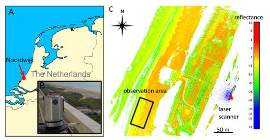 Location of the study site in Noordwijk, The Netherlands (A) with view of the Riegl VZ-2000 laser scanner mounted on the balcony of Grand Hotel Huis ter Duin (B) and point cloud colored with reflection (C) and indication of location of the laser scanner and study site.