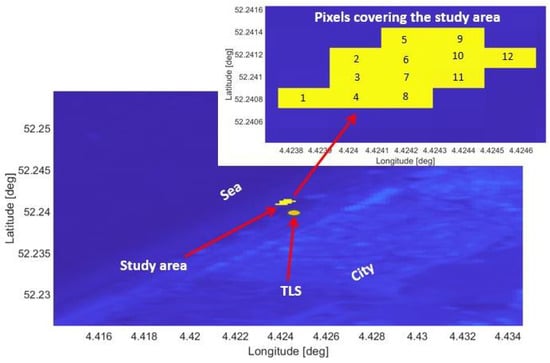 A total of 12 SAR pixels covers the study area, as shown in Figure 2. All the presented analyses have been conducted for these 12 pixels, which have homogeneous coverage (dry sand). Since SAR images are geo-coded, for each pixel the coordinates of the perimeter and of the pixel centre are known. For each PLS scan, all the PLS points included within each SAR pixels’ perimeter have been selected. Their median value has been considered as the PLS intensity of each pixel.