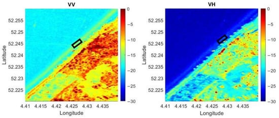 For the present study, Sentinel-1 data collected from Google Earth Engine have been used after further processing steps. A single orbit (DSC37, parallel to the Dutch coastline) has been selected. All the available Sentinel-1 images from the orbit DSC37 acquired from 19 August 2019 to 22 April 2021 at the same time (05:50 UTC) were downloaded (88 images). For Sentinel-1 images, it is possible to select the polarisation of the received signal: VH (vertical transmit, horizontal receive) and VV (vertical transmit, vertical receive) polarisation are available. In Figure 4, the averaged images in both VV and VH polarisation during the period of interest are shown. Regarding the polarisation effect, it is well-known that HH (horizontal transmit, horizontal receive) is more sensitive to surface scattering and VH to volume scattering, and VV a combination of the two. VH backscatter is therefore often used for the retrieval of crop parameters, and HH for ground parameters []. It has been shown that HH data are optimal for mapping surface water features when little to no roughness is present across the water surface. Alternatively, HV demonstrates superior results for water surfaces with increased roughness because of high winds [].