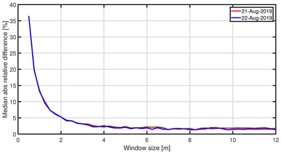 Then, the median value of has been computed. So, Figure 7 shows the median value of as a function of the window size for two point clouds, acquired in August 2019. Whilst a significant difference (35%) exists for small window size ( m), this difference is almost halved for 1 m cells and converges for window cells m, where the difference is about 2%. Therefore, the dimension of the SAR pixels ( 12 m × 20 m) has been used as an RMSH window cell size in the present study, with reduced influence of the laser scanner resolution.
