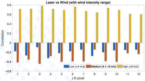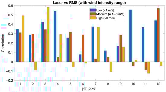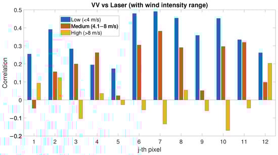 In order to further investigate the correlation between SAR backscatter and PLS intensity, other variables which might affect the signal (both PLS and SAR) have been taken into consideration. For this purpose, we consider wind speed and direction at the moment of the satellite passing and of the PLS scan of the beach. The wind speed has been considered separately for a first analysis: all the wind speed values have been divided into three categories: low wind (<4 m/s), medium wind (4.1–8 m/s), and high wind (>8 m/s). The correlation factor between PLS intensity and SAR backscatter dataset has been evaluated for each pixel in the three cases of low, medium and high wind speed.