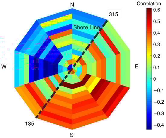 When considering the wind direction, see Figure 14, no significant correlation seems to exist between wind speed and RMSH, except for a slightly more regular positive correlation in the sectors ranging 90–270°, where there also seems to be a more homogeneous behaviour for the 12 pixels of the area when considering specific wind direction. For other directions, the correlation value is very variable for each considered pixel.