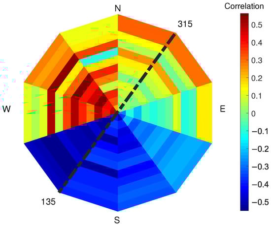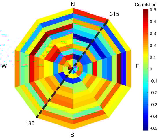Correlation factor (colour bar) between PLS intensity and SAR backscatter evaluated for different overlapping sectors ranging in 90° wind directions. In the figure, each sector represents a 90° wind-direction section and each of the 12 rings represent a row of pixels starting from pixel 1, which is located on the sea-side (inner ring), and moving towards pixel 12 (external ring), which is located on the city-side of the study area. The dotted black line represents the orientation of the shore line in Noordwijk.