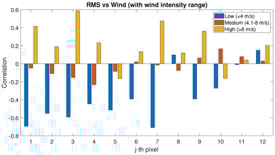 First, wind speed has been considered. Figure 11 shows the correlation factor between PLS intensity and wind speed for low-, medium- and high-wind-speed condition, compared to Section 3.3. For low and medium wind, each pixel shows that the PLS intensity decreases with increasing wind. For high wind speeds, the correlation turns positive and ranges for each pixel between 0.6 and 0.8. This change of sign in the correlation factor between PLS signal and high-wind-speed condition could explain the lack of correlation between PLS and SAR data, as shown in Figure 9. The wind direction has also been considered and the correlation factor between PLS intensity and SAR backscatter has been evaluated for each pixel and for each wind-direction section (See Figure 12). As in the previous section, the correlation factor has been evaluated for different overlapping sectors ranging in 90° wind directions. In the figure, each sector represents a 90° wind-direction section and each of the 12 rings represent a row of pixels starting from pixel 1, which is located on the sea-side (inner ring), and moving towards pixel 12 (external ring), which is located on the city-side of the study area. Again, certain directions show different correlation: in particular, the correlation factor between PLS and wind speed is negative for almost all pixels (up to 0.5) for wind directions ranging between 90° and 300° (mostly onshore wind), whilst a positive correlation exists (up to 0.5) for mostly offshore wind (directions ranging between 210° and 360°). The obtained results are shown in Table 2.